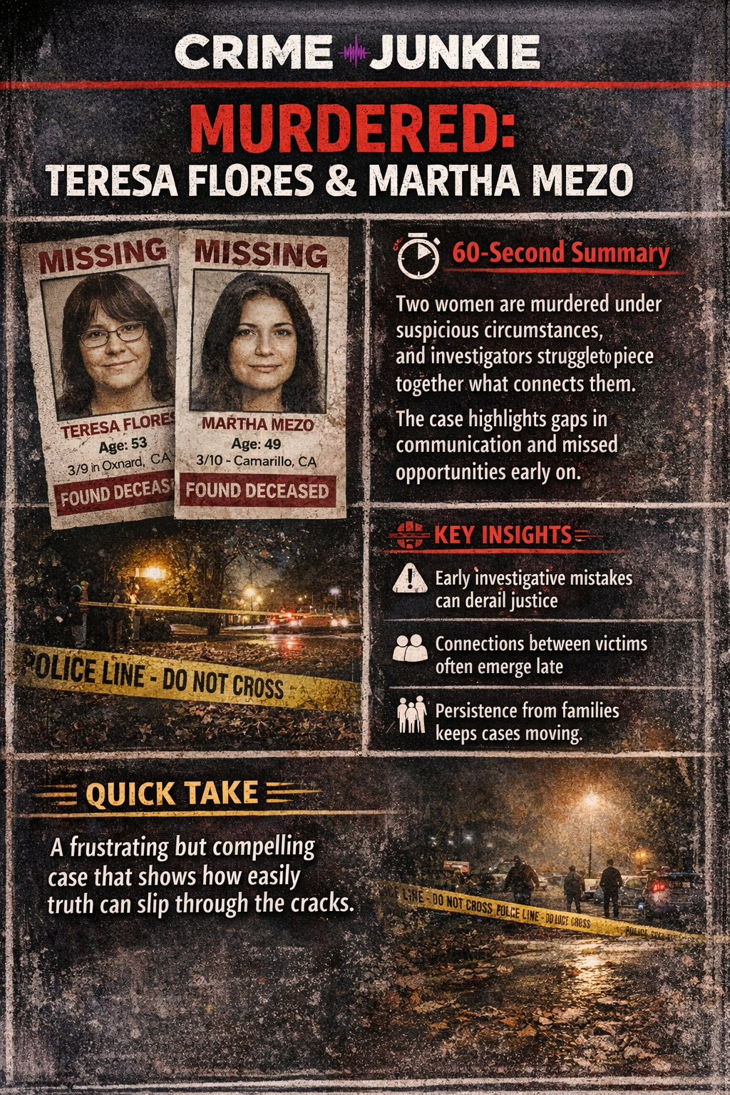 Two women are murdered under suspicious circumstances, and investigators struggle to piece together what connects them. The case highlights gaps in communication and missed opportunities early on.