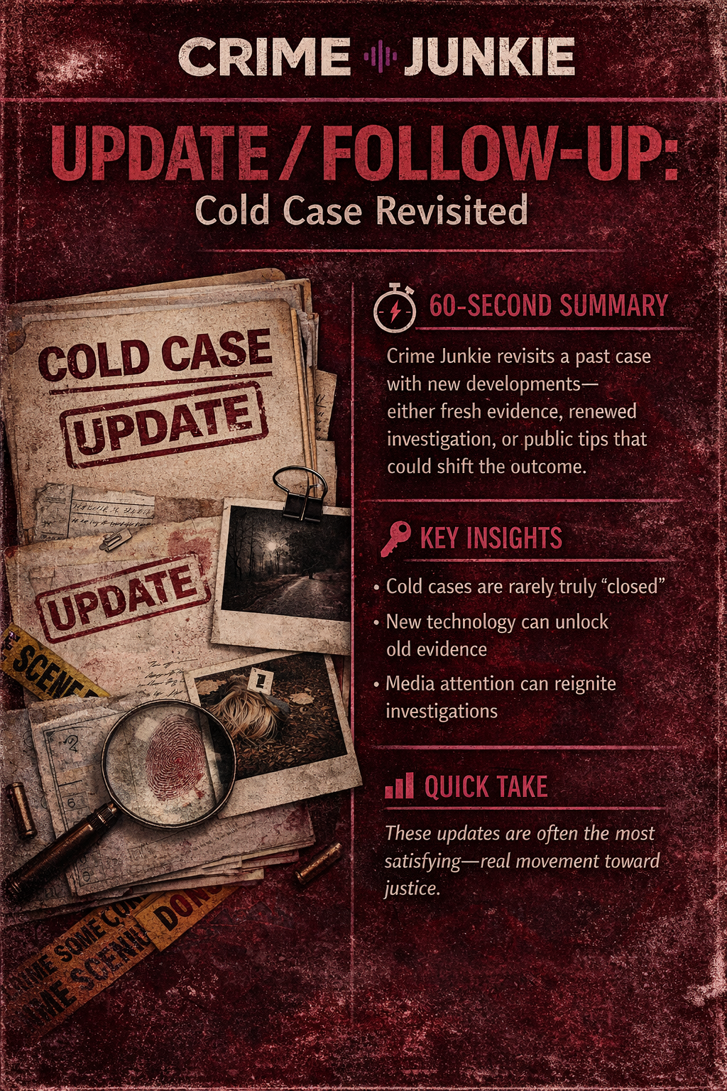 Crime Junkie revisits a past case with new developments—either fresh evidence, renewed investigation, or public tips that could shift the outcome.
