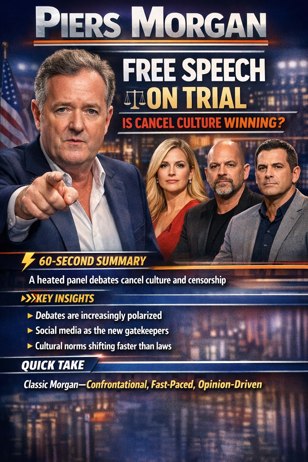 A heated panel explores whether free speech is under threat in Western societies. Morgan challenges guests on cancel culture, platform censorship, and where the line should be drawn.