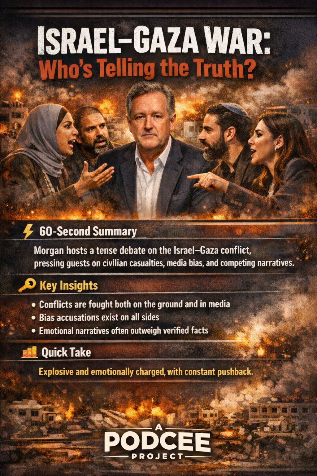 Morgan hosts a tense debate on the Israel–Gaza conflict, pressing guests on civilian casualties, media bias, and competing narratives from both sides.