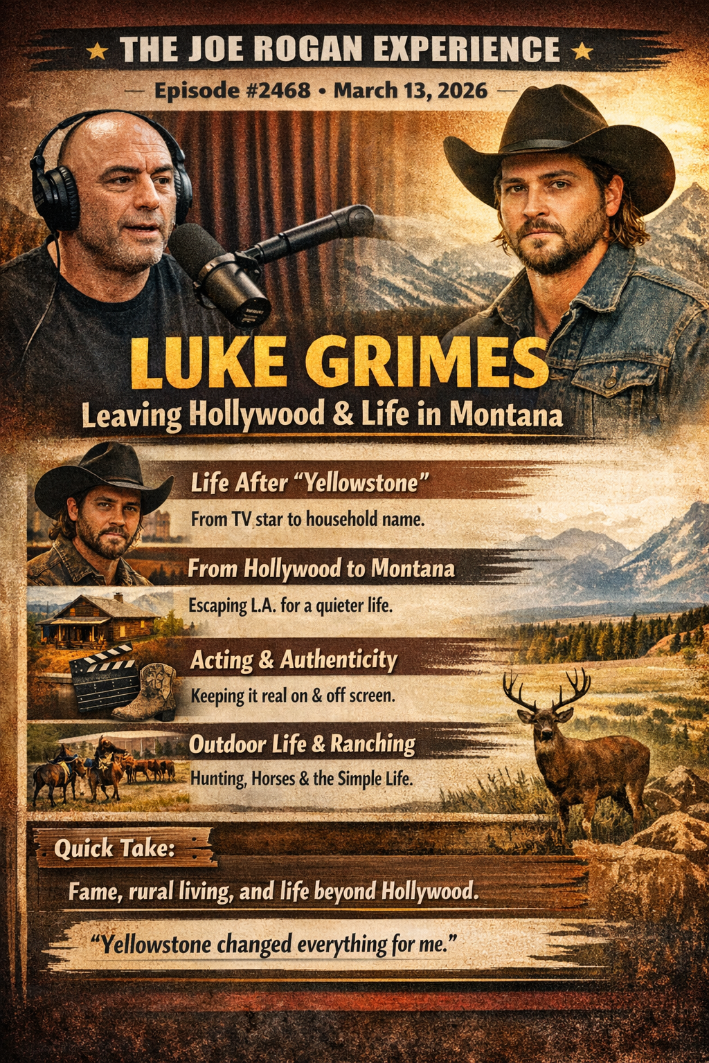 Rogan sits down with actor and musician Luke Grimes (known for Yellowstone) to talk about transitioning from acting into music, creative identity, and the realities of Hollywood fame. The conversation explores balancing artistic expression with commercial success.