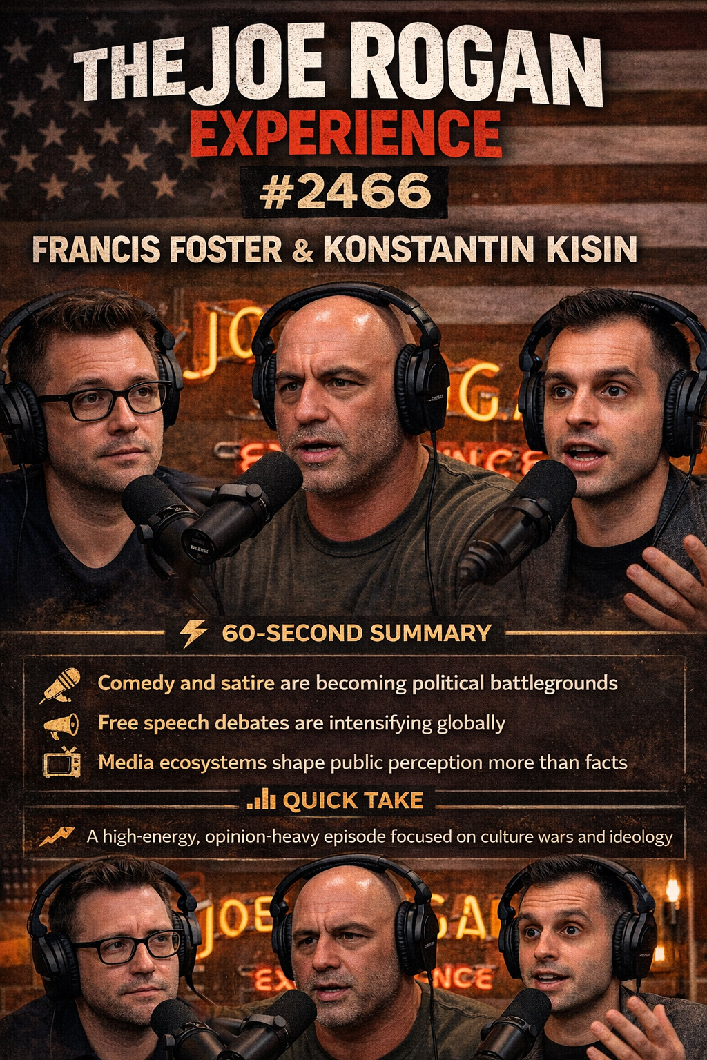 A high-energy, opinion-heavy episode focused on culture wars and ideology.