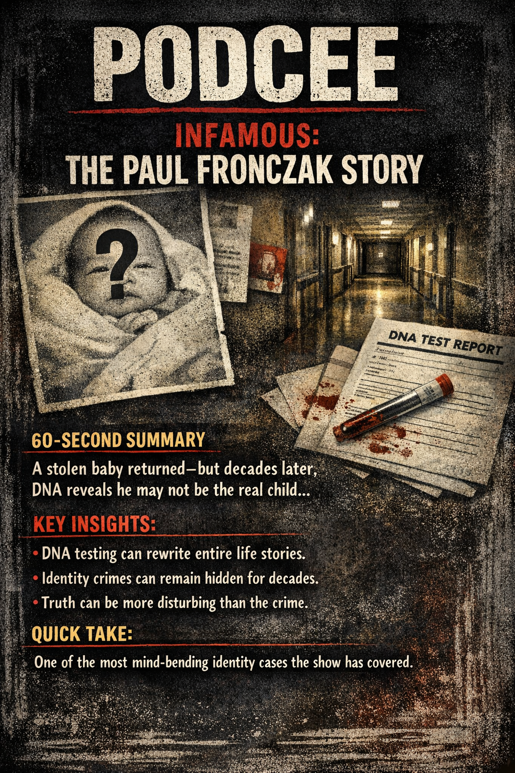 A baby kidnapped from a hospital is returned—but decades later, DNA reveals he may not be the real child. The episode dives into identity, deception, and a mystery spanning generations.