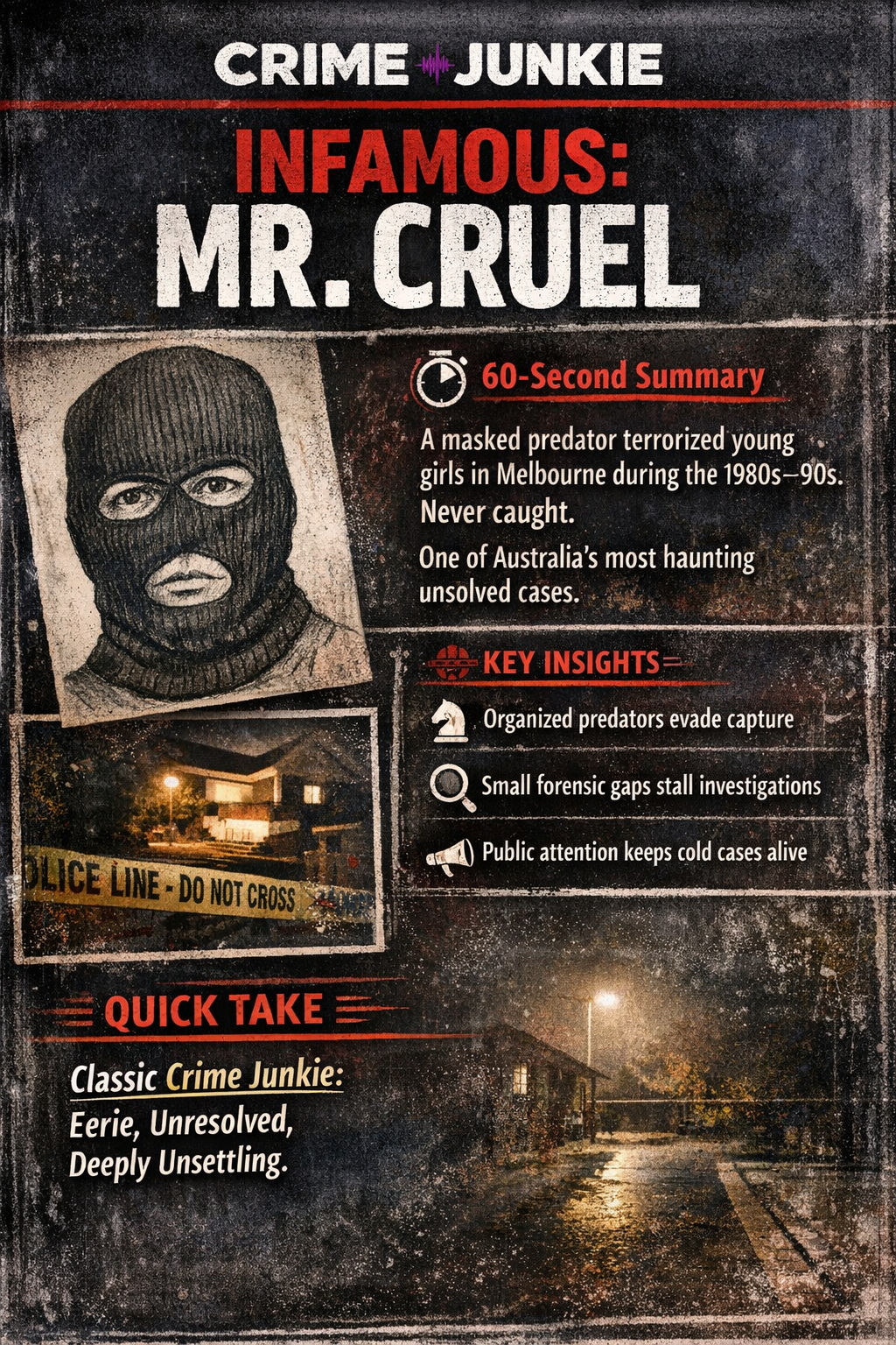 A masked predator known as “Mr. Cruel” terrorized young girls in Melbourne during the 1980s–90s. Despite meticulous planning and chilling precision, he was never caught, leaving one of Australia’s most haunting unsolved cases.