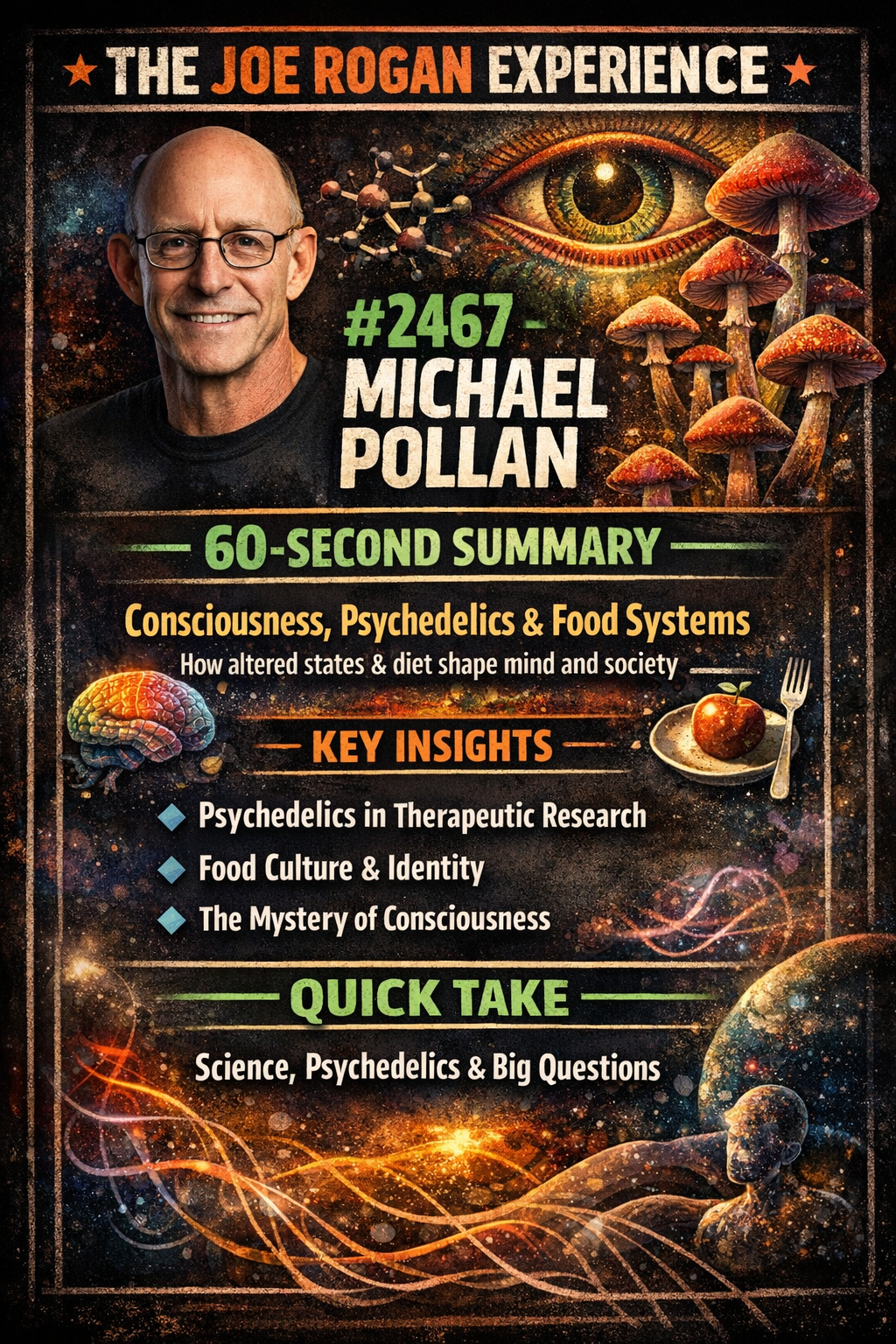 Pollan returns to discuss consciousness, psychedelics, food systems, and human perception. The episode dives deep into how altered states and diet shape both mental health and society.