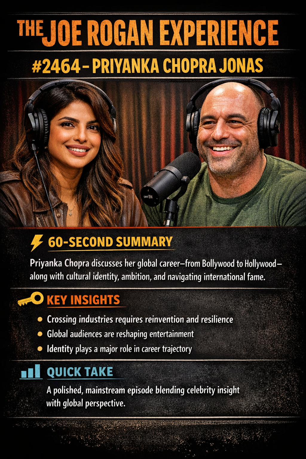 Priyanka Chopra discusses her global career—from Bollywood to Hollywood—along with cultural identity, ambition, and navigating international fame.